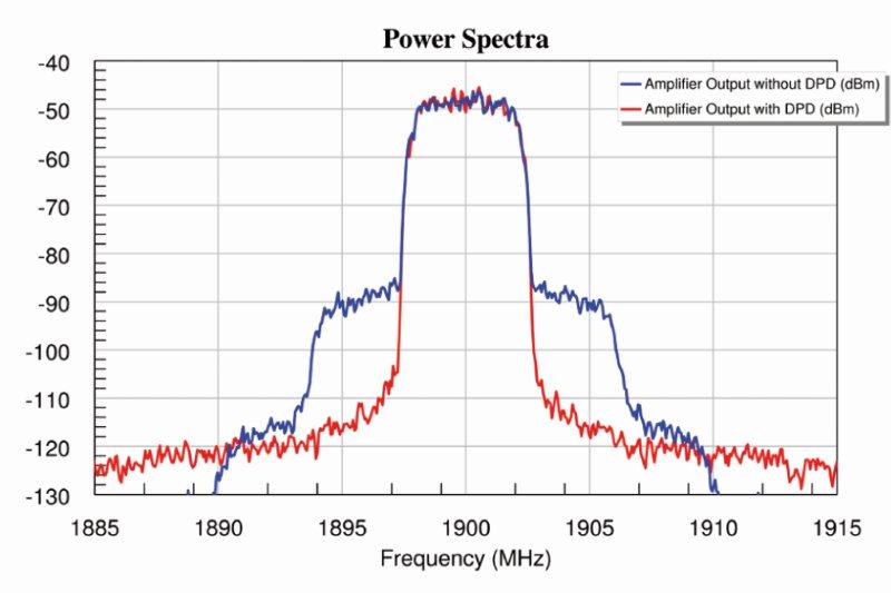 איור מס’ 10: תוצאות ההרצה של ה-Predistorter ב-VSS. האופיין כחול מתאר את אות המוצא של המגבר, ללא Predistortion, ואילו האופיין האדום מתאר את אות המוצא של המגבר עם ה-Predistorter, כפי שתוכנן וייושם ב-VI של ה-LabVIEW
