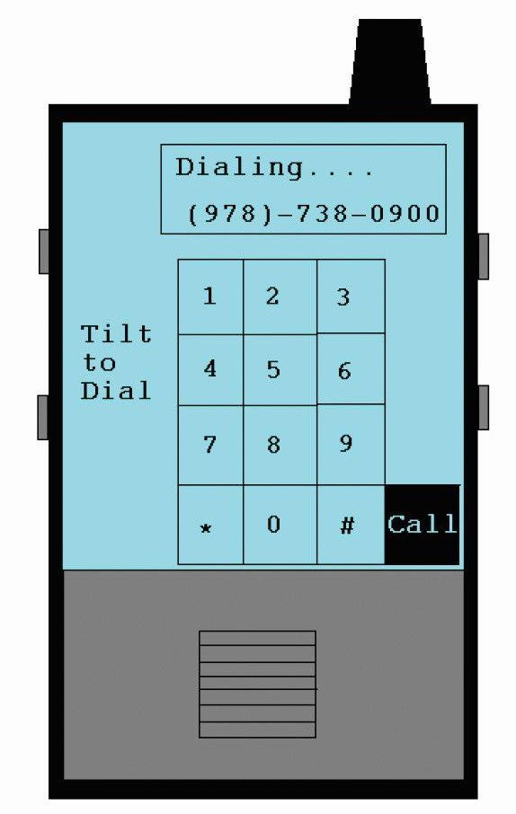 לשם חיוג מספרים עצמאיים (שלא כלולים ברשימת הקריאות) המשתמש יכול לנצל את אותה הגישה שנדונה לעיל עבור בחירת התפריט. ראה איור 5. בעזרת תנועות הטייה הפרשיות המשתמש יכול להדגיש מספר ולבחור בו על-ידי לחיצה על מקשי ה’enter’ בצידי הטלפון הסלולרי. כדי לבצע קריאה, המשתמש צריך להדגיש את מקש הקריאה וללחוץ על לחצן ה-enter בצד. צלילי השמע והלחיצה מעניקים למשתמש משוב תחושה ותנועה .