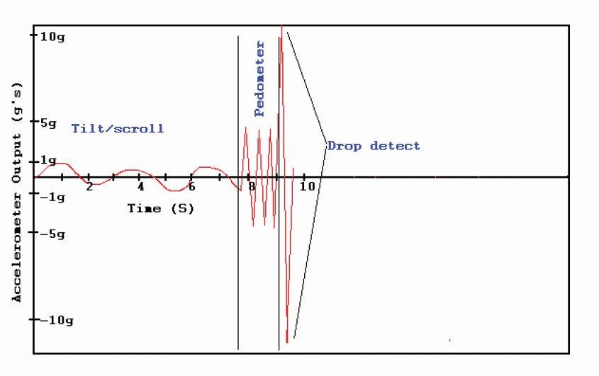 איור 8 מציג סוגים שונים של חתימות מוצא המתקבלים ממד-התאוצה במהלך סוגים שונים של פעילות תנועה. ניתן לבצע ניסויים כדי למדוד ולאפיין תנועות עבור יישומים אחרים נוספים. חתימות תנועה יהיו בעיקר תלויות במיקום מד-התאוצה בטלפון הסלולרי בנוסף למאפיין הפיזיקלי של הטלפון הסלולרי כגון ממדים, משקל וכד’.