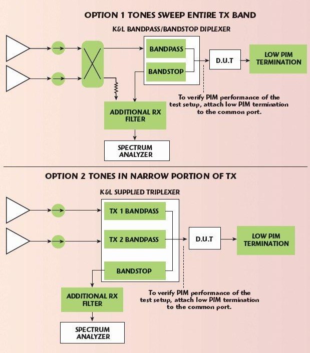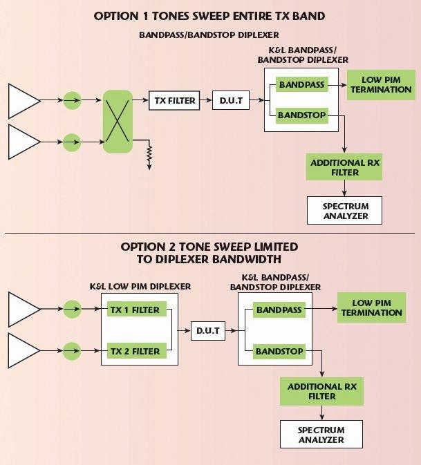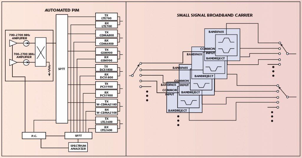 לבסוף, על-ידי ניצול המומחיות בבניית מטריצות של חברת Dow-Key Microwave, ניתן לשלב מסננים אלה במערכת המאפשרת בדיקה של תפקודים מרובים בתחומי תדר רבים. בדיקת PIM ניתנת לביצוע בעזרת מגברים רחבי-פס, משלבים (combiners) ונתחי ספקטרום. ביישומים בהם ביצועי ה-PIM אינם כה מחמירים, דוגמת בדיקת מכלולי שבבים סלולריים, ניתן לערוך מדידות כוזבות (spurious emissions) מחוץ-לתחום וניתן לספק כניסות צמודות כדי לאפשר הזרקת אותות מפריעים לשם בדיקת הביצועים בתנאי סביבה קשים. ניתן לתכנן פתרונות בדיקה עפ”י דרישות הלקוח כדי לענות לדרישות המדויקות של בדיקה מעבדתית של אב-טיפוס או לבדיקת ביצועים של החומרה בשלב הייצור. איור 4 מראה התקנות טיפוסיות עבור יישומי ה-PIM והאותות הנמוכים כאחד. נוחות הכיול היא יתרון נוסף הטמון במערכות בדיקה הממומשות בדרך זו.