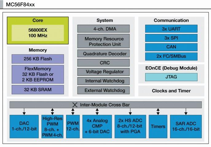 המיקרובקר MC56F84xx ל-100 מגה הרץ ול-32 סיביות, הוא אחד מבין המיקרובקרים לעיבוד אותות ספרתיים, המהירים ביותר הקיימים בשוק, והוא מציע יכולות בלתי רגילות של דיוק, חישה ובקרה, לקבלת יישומים שהם בעלי הנצילות הגבוהה ביותר, הקיימים להמרה ספרתית של הספקים ויישומים מתקדמים ביותר לבקרת מנועים. הליבה 56800 ל-32 סיביות הפועלת ב-100 מגה הרץ וב-100 מיליון פעולות בשנייה (MIPS) מספקת את היכולות המתמטיות הדרושות ליישומי הספק וליישומי בקרת מנועים, המתקדמים ביותר. פעולות חישוב מתמטיות במחזור יחיד, תמיכה באריתמטיקה של שברים ושל העברות במקביל משפרות את הביצועים ודוחפות חוגי בקרה הדוקים יותר ומהירים יותר. יחידת המיקרובקר MC56F84xx כוללת התקנים היקפיים מתקדמים, בעלי מהירות גבוהה ודיוק גבוה, ייעודיים ליישומי זמן אמת. מודול אפנון רוחב אות לזמן אמת, בעל רזולוציה גבוהה (eFlexPWM), עם רזולוציה של 312 פיקו שנייה, מאפשר תדירויות מיתוג גבוהות מאוד, במקביל להקטנה של עלויות ולהגדלת הנצילות. בלוק PWM נוסף מאפשר מימוש של בקרת מנועים כפולים. שני ממירים אנלוגיים לספרתיים למהירות גבוהה ול-12 סיביות (ADC), עם תדירות דגימה המגיעה עד ל-3.33 מגה-דגימות בשנייה ב- 300 ננו שניות, משפרים את דיוק המערכת, על ידי הפחתת הריצוד (jitter) שבערכי הכניסה. ממיר SAR מאנלוגי לספרתי, שפועל ב-16 סיביות, עם חיישן טמפרטורה מובנה ופער פס (band gap) משמש למדידת יישומים כללית. ארבעה מעגלי השוואה (קומפרטורים) אנלוגיים, עם ממירים ספרתי לאנלוגי (DAC) משולבים, הפועלים ב-6 סיביות, מאיצים את זיהוי אירועי המערכת ומאפשרים ביצוע כיבוי חירום של יציאות אפנון PWM. קוצבי זמן רב-שימושיים מאפשרים תזמון עצמאי ויצירה של אותות PWM. בלוק ההשהיות הניתנות לתכנות (PDB) מיועד לעירור (triggering) ממיר ADC בחומרה, בסנכרון עם אותות PWM, אשר נדרשות ליצירה מחדש של זרם המנוע. בלוק מפענח הקידוד הניצב מספק את פענוח הקידוד של אותות המיקום מהמקודד הניצב, אשר משמשים בדרך כלל במערכות הינע של מנועים תעשייתיים. גמישות השימוש בזיכרון הבזק (Flash) של 64 קילו-ביית עד 288 קילו-ביית מספקת את יכולת השדרוג הנחוצה ליישומים חשובים של בקרת הספק ספרתית ושל בקרת מנועים. בקר הגישה הישירה לזיכרון (DMA) מקטין את כמות הפסיקות לליבה ומגדיל את הביצועים. זיכרון EEPROM מסוג FlexMemory של Freescale מספק פנקס רשימות עבור ערכים של כיול וכיבוי. יכולת ההגנה על הזיכרון מגדילה את הבטיחות של המערכת על ידי הגבלת קוד המשתמש ועל ידי כך שהיא מונעת ממנו גישה אל למקומות חשובים בזיכרון ואל אותם התקנים היקפיים השמורים לגישה של פיקוח על. כניסות ויציאות עמידות ל-5 וולט מספקות גמישות תכנון והפחתה בעלויות המערכת. קבוצה עשירה של התקנים היקפיים לתקשורת, לרבות ממשקי QSCI, ממשקי QSPI, אפיק I2C/SMBus ואפיק FlexCAN מאפשרים קישוריות רב תכליתית עם מערכות שולט/נשלט (master/slave). חיבור צולב בין מודולים (inter module crossbar) הוא התקן היקפי רב תכליתי אשר מספק אפשרויות חיבור כלליות בין ההתקנים ההיקפיים שעל השבב: ממירי ADC, ממיר DAC ל-12 סיביות, מעגלי השוואה, קוצבי זמן QuadTimer, מאפנני eFlexPWM, בלוקי PDB, EWM, מפענח קידוד ניצב ופינים נבחרים של יציאות וכניסות.