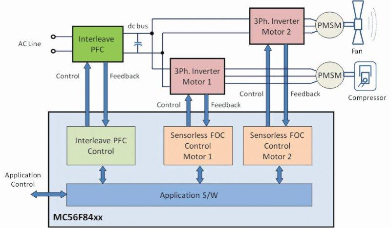 הרעיון מאחורי הפתרון מוצג באיור 2. אפשר לראות שבקר DSC מבקר את היישום כולו – את שני המנועים, את תיקון גורם ההספק (PFC), מספק את הקישוריות, ומספק פעולות בקרת היישום על המכשיר הביתי כולו. חומרת מערכת ההספק כוללת שני ממירי הספק למתח חילופין (inverter) המחוברים יחד למעגל אספקת מתח ישר, המערכת האלקטרונית של תיקון גורם ההספק, חישת המתח והזרם ואת אספקת מתח העזר.