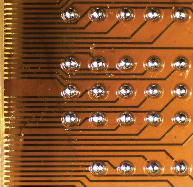 הרכבת פליפ צ’יפ – הרכבה ברמת הפרוסה של 4 שבבי פליפ צ’יפ למודול בוצעה על גבי מנשא קשיח שעליו מונח מצע גמיש של שכבות-דקות. התמצקות מחדש (reflow) של חומר ההלחמה בוצעה בטמפרטורה 260°C=(T(max באווירת חנקן. לאחר ההתמצקות מחדש (reflow)ניתן בקלות לבדוק את המודולים המורכבים על המשטח הנושא בעזרת קרינת רנטגן ומיקרוסקופיה אקוסטית [5].