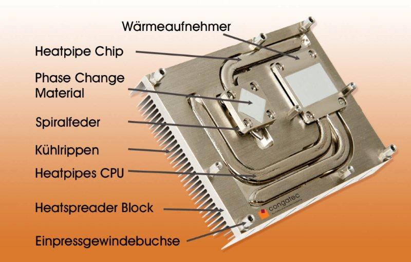 קירור נקודתי מהיר, חיבור תרמי טוב, ביטול המאמץ המכני וביצועי קירור משופרים, תוך שמירה על הממדים הגיאומטריים – להשיג את כל הדרישות הללו נראה כמו לבקש את הבלתי-אפשרי. אולם, congalec התגברה על האתגר על-ידי צירוף מתוחכם של הפיתרון הקלאסי עם צינור חום אשר עבר שינויים מבניים. שלא כמו התכנון הקלאסי, צינור חום שטוח משמש להעברת החום מהשבב אל לוח פיזור החום. צינור החום מותקן ישירות אל גושי הקירור על השבב ולוח פיזור החום. כתוצאה, יותר חום מועבר מסביבת המעבד אל לוח פיזור החום, נקודות חמות מקוררות מהר יותר והמעבד מקורר באופן מיטבי יותר. קפיצים ספירליים בעלי ממתח קפיצי מוגדר, כמו גם צינור החום עצמו, בעל הגובה הגמיש, מפעילים לחץ אופטימלי על שבב המעבד.