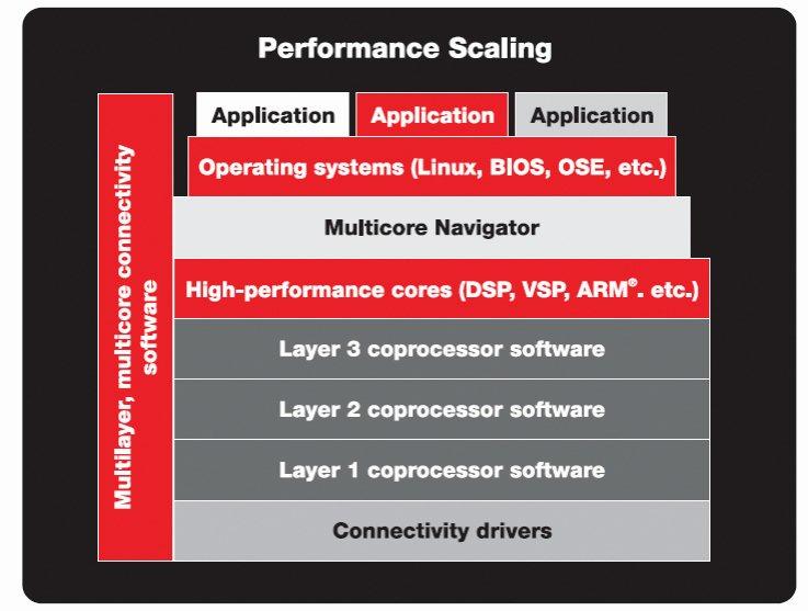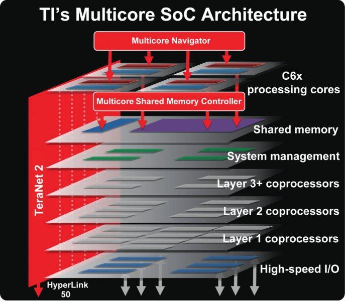 המעבר אל צומתי עיבוד מתקדמים יותר היה המניע העיקרי ליכולת העמידה בתחזית של חוק Moore. ההגירה לתהליך של 40 ננו-מטר (nm) סיפקה שיפור מרשים בביצועים, והמעבר ל-28 ננו-מטר יספק שיפור זהה, אם כי ליישומים של ימינו נדרש יותר מזה. היתרון הגדול ביותר הנגזר כיום מצומת עיבוד חדש הוא האפשרות לשילוב פונקציות רבות יותר של היישום בהתקן יחיד. מכאן שזה מנגנון אפשור (enabler) חשוב עבור מערכות על שבב. הטקטיקה הראשונה והברורה ביותר להשגת שיפור של פוטנציאל האינטגרציה, למען הגדלת הביצועים, היא באמצעות הוספה של ליבות הניתנות לתכנות. התקנים בריבוי ליבות מאופיינים כאחידים (הומוגניים), כלומר כאלו שבהם כל ליבות העיבוד זהות, או כלא אחידים (הטרוגניים), שבהם קיימת תערובת של ליבות מסוגים שונים. למעשה, כמעט לכל היישומים נדרשת תערובת של יכולות עיבוד, לרבות עיבוד אותות וקוד בקרה. ליבות עיבוד DSP וליבות ARM® RISC הן המתאימות ביותר לתערובת עיבוד זו. בחברת טקסס אינסטרומנטס (TI), ליבות עיבוד DSP המתקדמות ביותר תומכות הן בפעולות של נקודה קבועה והן בפעולות של נקודה צפה ומבצעות עיבוד של אותות וידיאו (VSP) בקצבים גבוהים של אותות שעון, ובכך הן מפשטות את פיתוח האלגוריתמים ואת פרישתם. ניתן להשיג מגוון של ליבות ARM, עובדה שמאפשרת לספק המערכות על שבב לבצע אופטימיזציה במבחר ליבות RISC, על מנת שיתאימו לדרישות העיבוד, לפיזור ההספק ולצומת העיבוד. מנקודת המבט של המבנה, חשוב שתהיה תמיכה במימושים של ליבות אחידות. אפשר ליצור התקנים אחידים (שבהם הכל ליבות ARM או הכל ליבות עיבוד DSP), מארכיטקטורה של התקנים לא אחידים (הטרוגניים), אבל הכיוון ההפוך אפשרי רק במקרים נדירים, אם מבקשים לא לגרום לפגיעה חמורה בביצועים. איור 1 שמופיע בהמשך, מתאר את ארכיטקטורת ריבוי הליבות KeyStone החדשה של טקסס אינסטרומנטס, המהווה דוגמה לארכיטקטורה של ריבוי ליבות לא אחידה.