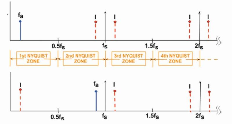 למעשה, דוגמים ממדרגים אותות ברוחב כל אזורי Nyquist. לדוגמה, תמונות של אות בתחום-בסיס בתדר fa יופיעו ב-fs+-fa, 2fs+-fa וכו’ (איור 1a). בדומה, אותות המופיעים סמוך לתדר הדגימה יומרו מטה לתדר ה-Nyquist הראשון. תמונה של אות זה תופיע גם באזורי Nyquist השלישי והרביעי (איור 1b). כך שדוגם בעל אנרגיית אות מבוא באזור Nyquist אחר מאשר זה שאתה מתעניין בו יפיק תמונה של האות הזה באזור Nyquist שאתה חפץ בו פשוט על-ידי מדרוג התמונה.