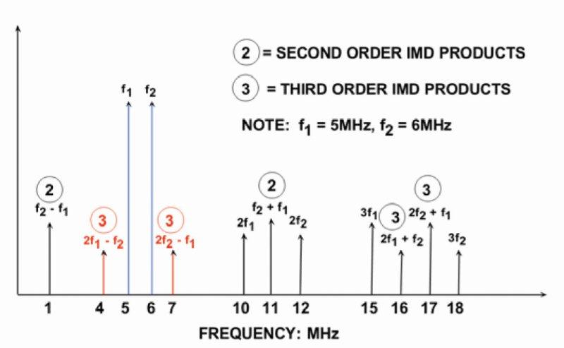 איור 4: אות מבוא דו-צלילי של 5 מגה-הרץ ו-6 מגה-הרץ מציג HD2 (ב-10 מגה-הרץ ו-12 מגה-הרץ), HD3 (ב-15 מגה-הרץ ו-18 מגה-הרץ), IMD (ב-1 מגה-הרץ ו-11 מגה-הרץ) ו-IMD3 (ב-4 מגה-הרץ ו-7 מגה-הרץ). מתוכם, מוצרי ה-IMD3 הם הקשים ביותר לניחות בעזרת מסנן נגד מדרוג בשל הקרבה הגדולה שלהם לאותות המקור.