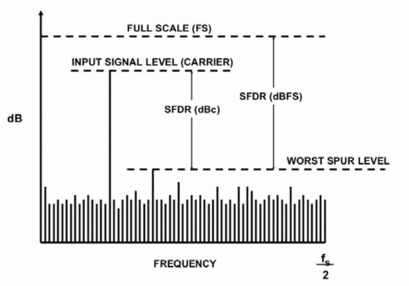 SFDR (spurious-free dynamic range) הוא פשוט מדידה של המוצר הספקטראלי הגרוע ביותר בהשוואה הן לתחום הסקלה המלאה של הממיר (dBFS) והן לרמת אות המבוא (dBc). וודא שזיהית הן רמות הייחוס והן תנאי ההפעלה והאות כאשר משווים ADCs. השוואות ישירות בין מפרטי דף-הנתונים דורשות התאמה בין הייחוסים והאותות (איור 5).
