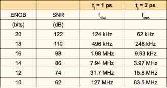 כדי לקבל מושג כיצד הריצוד משפיע על תדר האות המרבי עבור ENOB נתון, עיין בשתי מערכות בהן 1ps ו-2ps של רעש ריצוד, בהתאמה, שולטים על פרמטרים מגבילי- ביצועים אחרים. סידור מחדש של משוואה 4 מאפשר לנו לחשב, עבור ריצוד נתון, את תדר האות המרבי הגורם ל-ENOB (או SNR) מסוים.