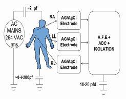 חלק זה של תכנון תת-המערכת ובחירת הרכיבים דורש מידול של המודל האנושי, החיבור הסביבתי של רשת ה-ac וה-RFI המגיע אל ובתוך המטופל, וההשפעה הנגרמת על ביצועי מגבר ה-ECG כאשר הוא נוטה לדחות את אותות המוד המשותף המגיעים. ה-RFI המגיע מבוטל בשיטות מרובות, כולל סינון הפרשי ומוד משותף, סיכוך סביבתי ואלגוריתמים.