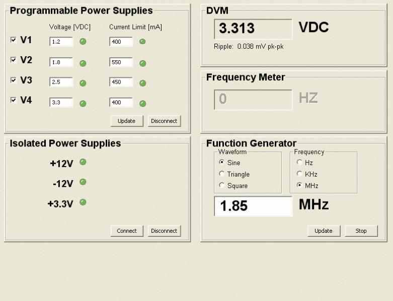 3 ספקי כוח מבודדים ובלתי תלויים מאפשרים אספקת מתח למעגלים אנלוגיים או למעגלים להם חוזר אדמה שונה. הפעלת הספקים נעשית באמצעות תוכנת ההפעלה וחיווי על מצב המוצא מופיע על מסך ההפעלה.