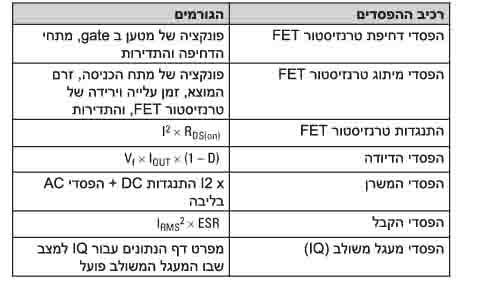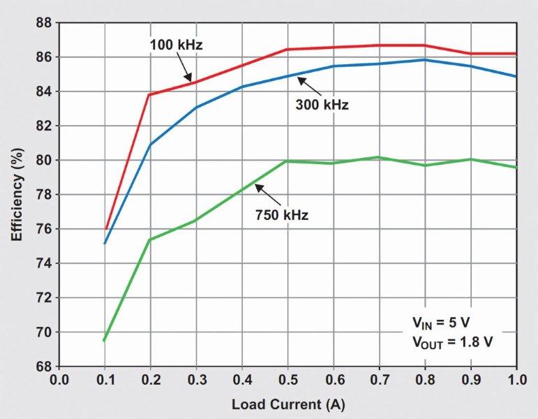רכיבי ההפסדים החשובים בשלוש הדוגמאות הם הפסדי דחיפת טרנזיסטור ה-FET, הפסדי המיתוג בטרנזיסטור ה-FET והפסדי המשרן. ההתנגדות של טרנזיסטור FET והפסדי המעגל המשולב הם ערכים קבועים, מאחר שאותו מעגל משולב שימש בכל שלושת התכנונים. מאחר שבכל אחת מהדוגמאות נבחרו קבלים קרמיים עם התנגדות טורית שוות ערך נמוכה, הפסדי הקבלים נחשבים לזניחים. על מנת להדגים את ההשפעות של תדירות מיתוג גבוהה על הנצילות, נמדדה הנצילות בכל אחת מהדוגמאות והתוצאות מוצגות באיור 2. באיור זה אפשר לראות בבירור שהנצילות פוחתת ככל שתדירות המיתוג עולה. על מנת לשפר את הנצילות בתדירות מיתוג כלשהי, יש לחפש ממיר מתח עם מפרט בעל התנגדות נמוכה במצב הולכה של הטרנזיסטור (ON) בין ה-drain לבין ה-source, טעינה נמוכה של ה-gate או quiescent-current נמוך כאשר המעגל עובד בעומס מלא. כמו כן, פשוט ניתן לחפש קבלים ומשרנים בעלי התנגדות נמוכה יותר.