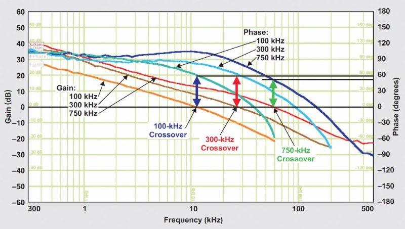 תגובת המעגל לשינוי מתח (transient) היא אבן בוחן טובה לרמת הביצועים של ספק כוח. תיעדנו את עקומת Bode של כל אחד מספקי הכוח, על מנת להציג השוואה בתדירויות מיתוג גבוהות יותר (עיין באיור 3). כפי שאפשר לראות, עודף מופע של כל אחד מספקי הכוח נמצאים בין 45 ל-55 מעלות. המשמעות של תוצאה זו היא תגובת מעגל שמשככת היטב את שינוי המתח. תדירות המעבר (crossover frequency) היא בערך שמינית מתדירות המיתוג. כאשר משתמשים בממיר ממותג מהיר, יש להקפיד שלמגבר השגיאה יהיה רוחב פס מספיק כדי לתמוך תדירות המעבר הגבוהה. מכפלת היחידה האופיינית של מגבר השגיאה של TPS54160 היא 2.7 מגה-הרץ. זמני התגובה הממשיים לשינוי מתח חדים מופיעים בטבלה 5 עם הערכים המיוחסים להם לגבי overshoot בשיא המתח. הערך של overshoot נמוך באופן משמעותי בתדירויות מיתוג גבוהות יותר, וזאת בזכות רוחב הפס הגדול יותר.