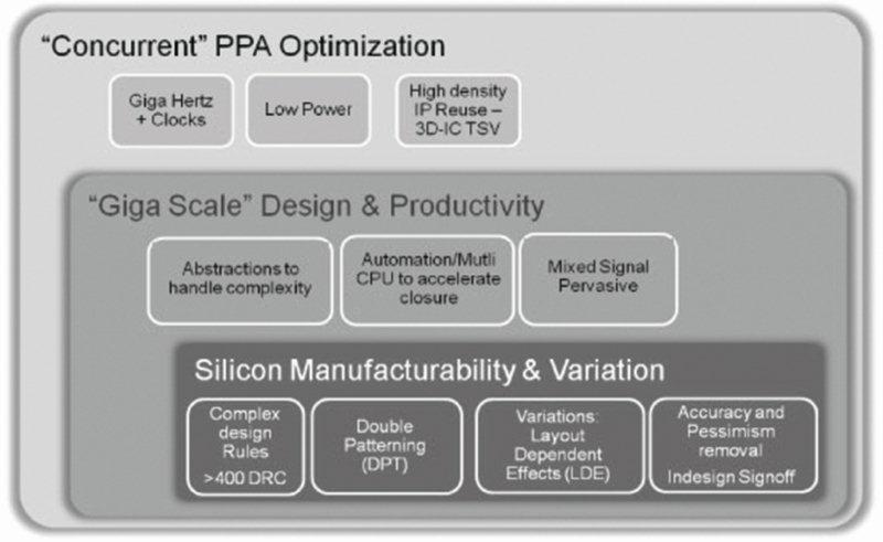 שבבי 20 ננו-מטר לא יהיו רק גדולים. לשבבי 20 ננו-מטר רבים יהיו ביצועים בגיגה-הרצים, סכמות שעון מורכבות ואזורי מתחים שונים. כל דבר משפיע על כל דבר אחר, ויש לקחת בחשבון הספק, ביצועים ושטח (power, performance and area PPA) בו-זמנית. יכולת אחת אשר תידרש היא מתודולוגית אופטימיזציה באמצעות ליבות-מרובות אשר פועלת לאורך תהליך התכנון הפיסיקאלי של ה-IC.