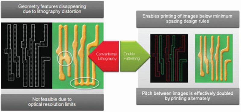 הנה כיצד הדבר עובד. כאשר לשכבת מתכת יש תבניותסמוכות מידי זו לזו מכדי להפריד בליתוגרפיה של 193 ננו-מטר, הדפס כפול מחלק את השכבה לשתי מסכות נפרדות. כל מסכה נחשפת בנפרד, והחשיפות חופפות כדי ליצור תבניות שהן בעלות מחצית המרווח שניתן היה להדפיס באמצעות ליתוגרפיה של 193 ננו-מטר (איור 2). הדפס כפול דורש אפוא מסכות נוספות, ביחד עם הפרדת התסדיר לשני צבעים הקובעים כיצד התסדיר ימופה ללמסכות.