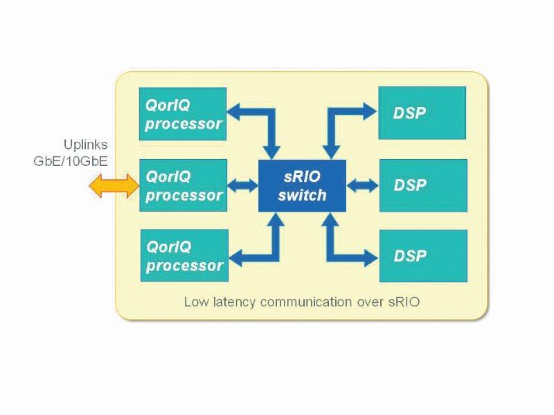 עבור זמן אחזור קצר, ממשק RapidIO הטורי מהווה דוגמה לבחירה מצוינת עבור תקשורת בין מעבדים, כלומר החלפה של נתונים בין מעבדי QorIQ מרובים, עם תמיכה אפשרית עבור מעבדי DSP, כפי שאפשר לראות באיור 2. בזכות היכולת הגבוהה של קישורים טוריים מהירים שיש לכרטיסי מעגל AMC, הם מהווים בחירה מצוינת עבור מעבדי QorIQ ועבור אפשרות השימוש של כרטיסי DSP. במערכת של כרטיס מעגל AMC, מתג RapidIO הטורי מופיע כמתג מארג ברכזת הנושאת MicroTCATM (MCH), כמו לדוגמה MCH AM4904-SRIO. החיבורים של sRIO משמשים כממשקי מארג עבור מישור הנתונים.