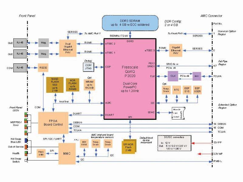 מוסכמות, שקיימות לגבי כרטיסי מעגל AMC עבור מעגלי אם, ממומשות במחבר של כרטיס AMC ומאפשרות שילוב של כרטיסי מעגל AMC של ספקים שונים. תכנון לדוגמה של מעגל AMC מבוסס QorIQ מוצג באיור 3. הקישוריות הבסיסית שבין מעגלי AMC מתבצעת דרך ממשק GbE בחיבורי port 0 ו–1 שבמעגלי AMC. חיבורי port אלו מתחברים במערכת למתג Ethernet שברכזת MCH שמספקת גם חיבורי כינוס חיצוניים למערכת דרך ממשק GbE או 10GbE.