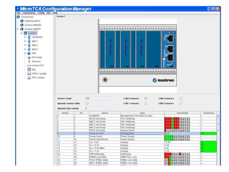 על מנת להקל את ביצוע הקונפיגורציה של המערכת דרך ממשק IPMI, חברת Kontron מספקת בתוכנת OMVIU ממשק משתמש גרפי, שאותו אפשר להתקין כיישום בשפת Java בכל סוג של מחשב אישי או שרת. מערכת ניהול הקונפיגורציה של MicroTCATM תומכת בהדמיה ממוחשבת מבוססת סמלים של המערכת ושל המצבים שלה, בניטור של אירועים ובמעקב אחריהם, בעזרי רישום שגיאות ובנקיטת פעולות מתקנות באמצעות הדמיה ממוחשבת ולחיצות עכבר. איור 5 מציג מסך לדוגמה של הכלי לניהול קונפיגורציה.