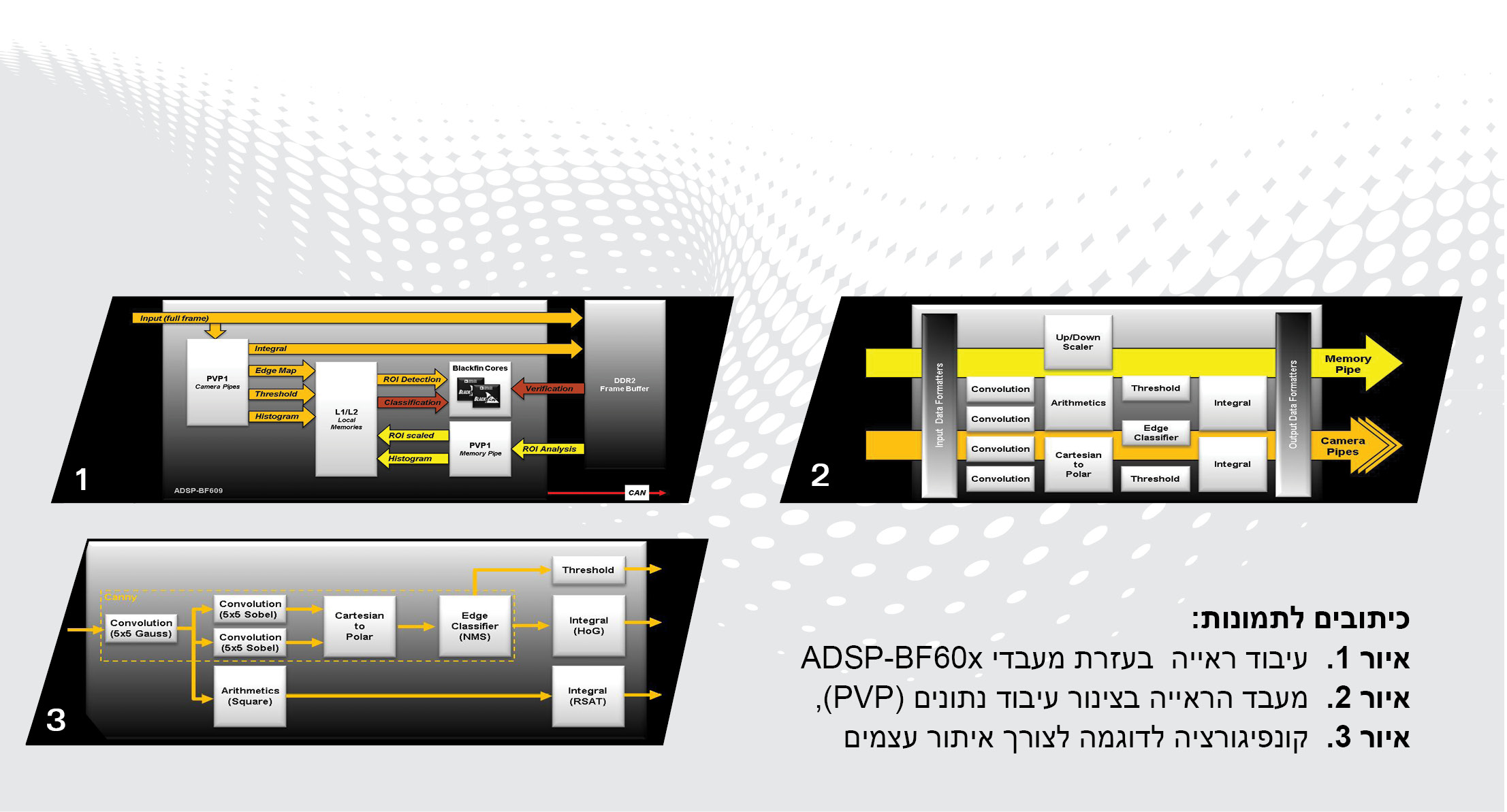 יצרני מכוניות (יצרני ציוד מקור – OEM) וספקי מערכות (מהרמה הראשונה – Tier 1s) מסכימים פה אחד: המערכות המתקדמות לעזרת נהגים (ADAS) עומדות להפגין עקומת גידול תלולה בשנים הבאות, והגורם המניע, ללא כל ספק, הוא הערנות הגוברת לבטיחות הנהג והשאיפה הבלתי פוסקת להגברת נוחות הנהיגה שלו. המובילים הראשונים והעיקריים של תהליך זה, הם ארגוני הבטיחות האירופיים (NCAP), אשר בהציבם את דרישות הבטיחות הקפדניות שלהם, הם דוחפים את תחום הציוד עבור מערכות ADAS, ממחזור ייצור בעל שיעור הכנסות שניתן למדוד אותן על אצבע אחת, למחזור ייצור עם גידול של 100% כמעט, הצפוי במרוצת השנה הבאה. לא ייפלא לכן, שעל הפרק עומדת דרישה לפתרון בעל יכולת קיום מבחינה מסחרית. וזאת, על מנת לענות על הדרישות של פרישות חדשות, כמו ציוד סטנדרטי בכמויות גדולות, לעומת האפשרות המתונה של צריכה עסקית, אשר נראית כיום. חברת Analog Devices הכריזה לאחרונה על משפחת מעבדי ADAS – הסדרה ®Blackfin ADSP-BF60x – שפותחה עבור דרישות השוק שעולות ומופיעות בכמויות רבות. את שני המעבדים הראשונים של משפחה חדשה זו אפשר לקבל כבר עתה, כדי לספק את הדרישה החדשה עבור פתרונות מבוססי מצלמה.