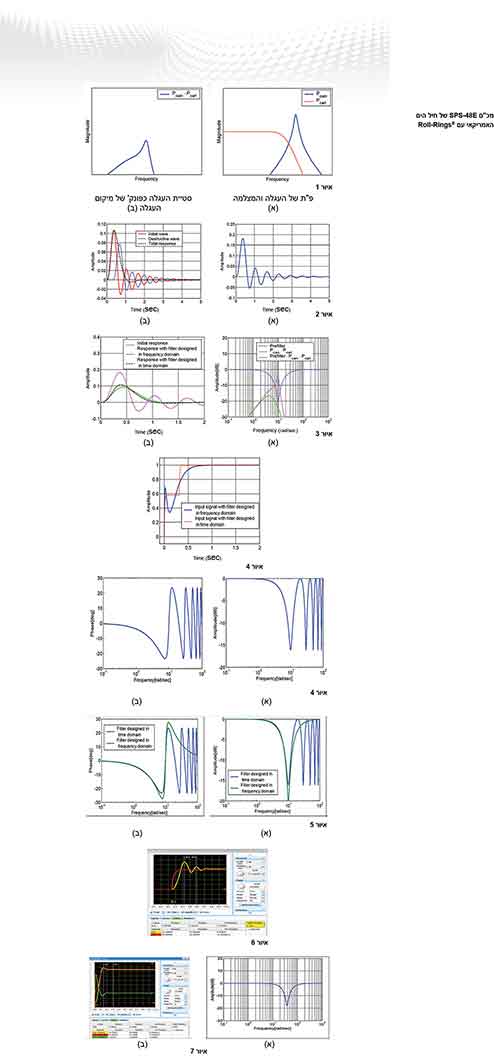 מוצגת באיור: 1א’ (קו כחול). סה”כ פונקצית התמסורת מפקודת מיקום העגלה לסטיית המצלמה היא מכפלת שתי הפונקציות. אמפליטודת תגובת התדר של המכפלה מוצגת באיור: 1ב’.