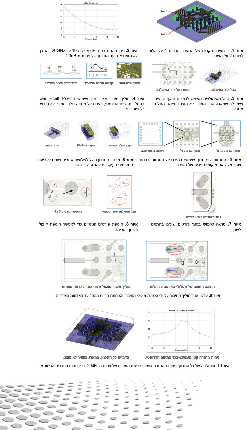 איור 1 מציג את הלוח, המודול וסביבת השבב הנחקר. האות יוצא מפורט 1 על מסלול בלוח המעגל המודפס לתוך המודול באמצעות BGA, לאורך מסלול בראש המודול, אל פורט 2 על השבב באמצעות מוליך חיבור. מטרת התכנון היא להגיע לניחות החזרה של פחות מ-20dB- בכל תחום התדרים המעניין, 10 עד 20GHz.