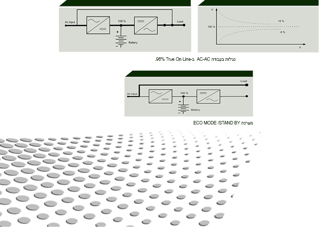 מערכת TRUE ON LINE בכל מקרה תצרוך זרם מינימלי מהרשת ותקטין ב-25% את צריכת הזרם מהרשת בצד הקנסות הכרוכים בכך. המערכת מייצרת בידוד בין הציוד לרשת.