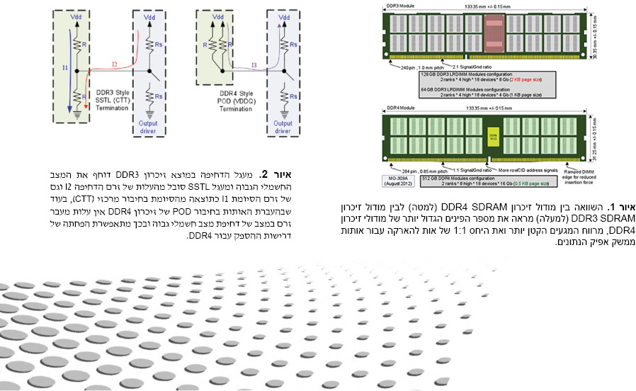 השוואת זיכרון DDR3 LRDIMM לזיכרון DDR4 RDIMM מראה שאפשר ליצור את מודול DDR3 SDRAM הגדול ביותר במארזים של ארבעה שבבים (QDP) של התקני DRAM ב-8 ג’יגה סיביות עם x4, ולהגיע לקיבולת תיאורטית מרבית של 128 ג’יגה ביית עבור מודול זיכרון יחיד (עיין באיור 1). איור 1 מראה גם שאפשר ליצור זיכרון DDR4 RDIMM עם יחידות של שמונה מחסניות DRAM ולתמוך בקיבולת תיאורטית מרבית של 512 ג’יגה ביית לכל מודול. בנוסף, תרשים זה מראה שמספר הפינים במודול זיכרון DDR4 הוגדל ל- 284 פינים על מנת לתמוך ביכולת מיעון גבוהה יותר וביחס של 1:1 של אות להארקה עבור אותות ממשק אפיק הנתונים (DQ). באופן כללי, האיור מדגיש כמה שיניים ברכיבים וברמת המודול אשר מאפשרים למודול זיכרון DDR4 לתמוך בו זמנית בקיבולת גבוהה יותר ובביצועים גבוהים יותר מאשר מודול הזיכרון DDR3.