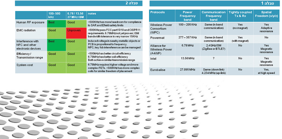 את ההבדלים בין המערכות האלה במונחים של נצילות, עלות ותאימות לתקני קרינה, ניתן לראות בטבלה 2 המספקת את הנתונים הללו. הטכנולוגיות קובצו לפי תדרים שמשתמשים בהם. בטור תדירויות אחד נמצאות המערכות של WPC ושל ®Powermat שפועלות בתדירות של פחות מ- 500 ובטור השני מרוכזות מערכות אחרות המשתמשות בפסי התדירויות של ISM ב- 6.78, 13.56 או