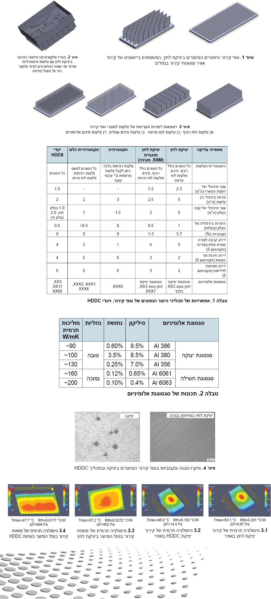בטבלה 1 מתוארות כמה מהיכולות של תהליכי היצור האמור של גופי קירור, עבור צלעות בגובה 60 מ”מ. אנו מצפים שההנחיות הרגילות הישימות ליציקת לחץ [1, 3] תהיינה ישימות גם ב- HDDC, אולם עם יכולת משופרת לצלעות דקות יותר וקירות מארז דקים יותר, יחד עם זווית היצרות בצלעות ובקירות, ועם פרטי פני שטח כגון שקעים, בליטות וצלעות.