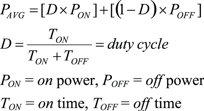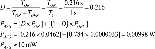 PON הוא פיזור ההספק של המערכת במצב התפעול הרגיל. POFF הוא תקורת המערכת במצב off. הוא בסדר גודל של 1 מיקרו-אמפר, בהיותו קשור לזרמים שרידיים, כגון שמירה על מתג כוח או מוד כיבוי בווסת הספק. זמן ה- (TON) הוא כמות הזמן הדרושה למערכת החיישן להידלק, ליצור מדידה רצויה ולכבות בחזרה את המערכת. זמן ה- (TOFF) תלוי בתדירות בה המערכת דורשת מדידות חיישן. אם הספק ה-off הוא הרבה יותר קטן מאשר הספק ה-on, פיזור ההספק הממוצע יחסי במהותו למחזור הפעולה. לדוגמה, אם הספק ה-off הוא אפס ומחזור הפעולה הוא 10%, פיזור ההספק הממוצע הוא 10% מהספק הפעולה הרגיל.