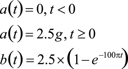 לאחר הפעלת הכוח, מוצא מד-התאוצה של החיישן (t), מציג היענות מדרגה. מאחר שהחיישן מוזן על-ידי מקור יחיד המוצא שלו יתחיל כנראה באפס ויעבור במהירות לרמה הקובעת את הכיוון שלו. לשם פשטות, נניח שמוצא אפס מתאים לרמת התאוצה המזערית הזמינה. במקרה זה, אנחנו משתמשים ב-2g-, כדי לספק גבול כלשהו מעבר למינימום המפורש של -1.7g. כמו כן, תחום ההטיה המרבי הוא +300, שווה-ערך ל- -+0.5g. צירוף של שני מרווחים אלה, המעבר המרבי שאות מד-התאוצה יבצע בתחילת התהליך הוא