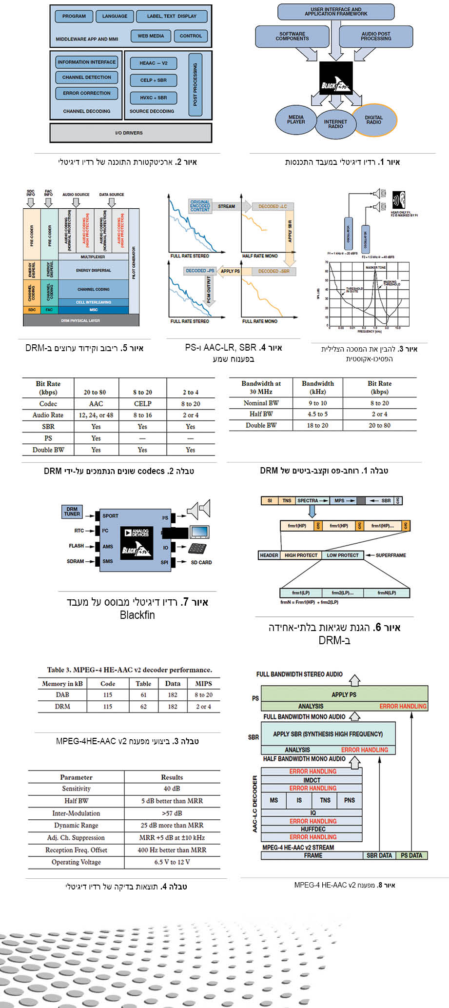 ניתן לבנות מכשירי רדיו מבוססי מעבד Blackfin, מכשירי רדיו אינטרנט ומוצרים מרובי-תכונות תוך שימוש במערכת האקולוגית הקיימת ש-ADI יצרה עבור מוצרים אלה. בנוסף ליצירת המערכת האקולוגית הדרושה ולספק את מודולי התוכנה השונים, ADI גם יצרה ספריות פענוח משלה עבור רדיו דיגיטלי. רכיב-מפתח אחד כזה הוא המפענח HE-AACv2, המייטב את הביצועים הזמינים מהמספר הגדול של MIPS דרושים.