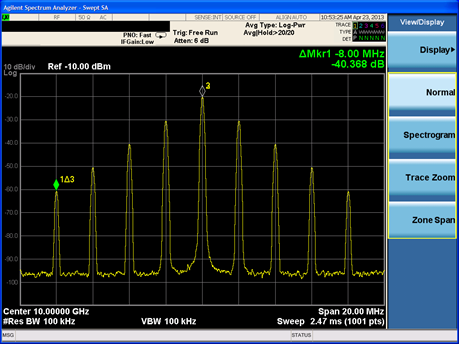 כדוגמה, בתמונה 1 מוצגות שתי מדידות ספקטרום של אות multi-ton של 10GHz. האות מתאפיין ב-side tones שממוקמים במרווחים שווים בתדר וכן באמפליטודות שנמוכות ב-10dB לעומת הטון הסמוך. מדידת הספקטרום שמשמאל נלכדה באמצעות נתח אותות שולחני גבוה ביצועים, בעוד שהמדידה שמימין נלכדה באמצעות מכשיר נייד, בעת פעולתו במצב של נתח ספקטרום.