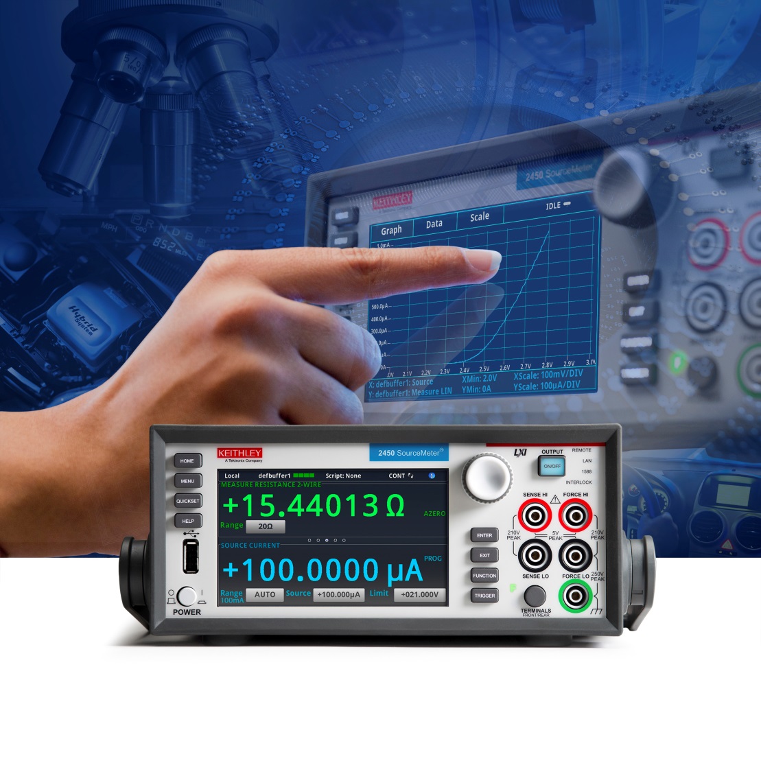 בתמונה מכשיר מקור/מודד 2450 הראשון בתעשייה עם מסך מגע המציע אינטראקצית משתמש תפעולית בדומה לטלפון חכם. גרפיקה אינטואיטיבית זו פותחה כדי לאפשר לכל המפתחים לימוד מהיר, מרחב עבודה חכם וגם מקל על תהליכי הפיתוח.