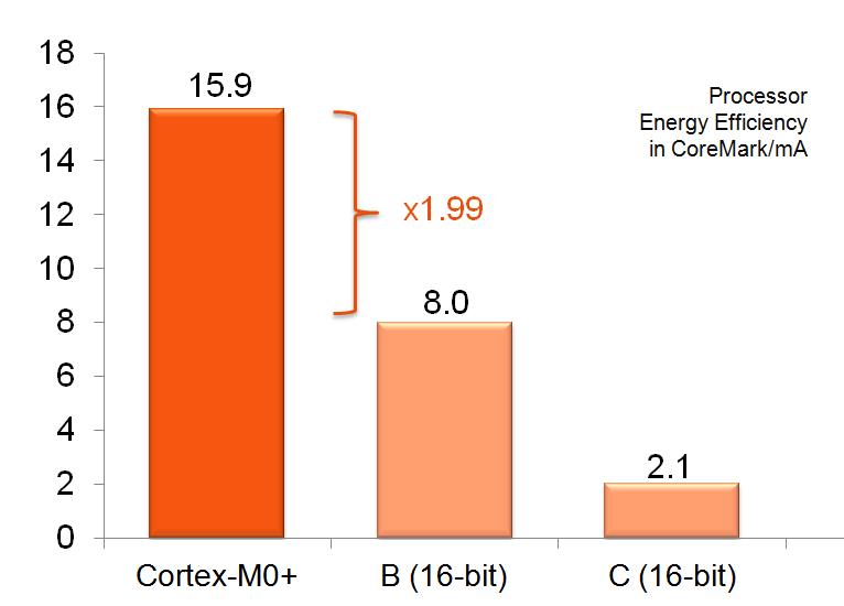 לליבת Cortex-M0+ יש גם נצילות גבוהה מאוד, והיא משיגה פי שניים Coremark®/mA יותר מאשר המתחרים ב-16bit. בשילוב עם ליבת Cortex-M0+ החזקה יותר, מערכת משובצת יכולה להשתמש בפחות אנרגיה, בכך שתוכל לסיים את ביצוע המשימות שלה בצורה הרבה יותר מהירה, ותחזור למצב שינה.