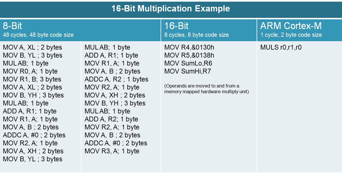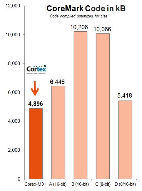 האפשרות ששימוש במעבד של 32bit יוביל לגודל קטן יותר של הקוד נראית מנוגדת למחשבה אינטואיטיבית. עם זאת, ליבת Cortex-M0+ משתמשת בפקודות Thumb-2, שרבות מהן משתמשות ב-16bit בלבד בזיכרון ההבזק (flash). ועוד דבר שיש לזכור, בפועל, פקודות רבות במעבדי 8bit ארוכות יותר מ-8bit. כמו כן, כתלות ביישום, אפשר להחליף כמה מבין הפקודות ב-8bit בפקודה יחידה במיקרובקרים ל-32bit, כמו במקרה של הכפלת משתנים של 16bit המתואר באיור 2.