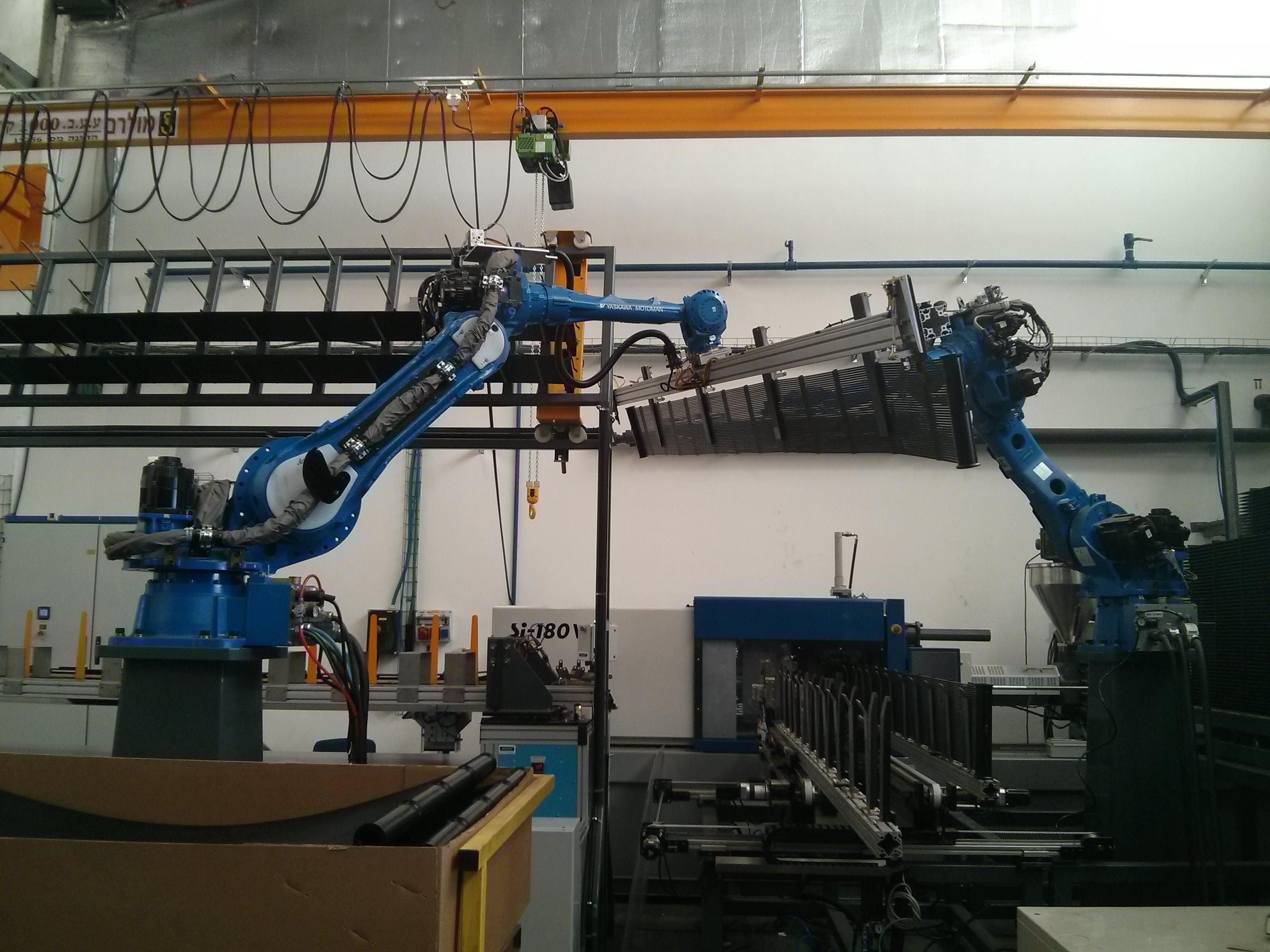 כתוצאה מהגדרת הצרכים קבלנו מערך רובוטי המבוסס על עבודתן של שתי מכונות הפועלות במקביל: הרובוט הראשון “לוקח” את המחצלות ממתקן המכיל כ- 200 מחצלות ואשר התקבל ישירות מקו הייצור של המחצלות ; מזין אותן לתוך מערכת הכוללת שני אוכפים שבכל אחד מהם מצוי גריפר לתפיסת קצה הצינוריות והזנה מסודרת לתוך התבנית, ללא צורך בהתערבות עובד הייצור; בכל רגע נתון נמצא אוכף אחד עם מחצלת בתוך מכונת ההזרקה (להזרקת סעפת בקצה המחצלת); בסיום הזרקת צד ראשון, הופך הרובוט את המחצלת כדי להזריק סעפת בצדה השני; בסיום הזרקות של שתי סעפות, מוסר הרובוט את המודול המוכן לרובוט השני. הרובוט השני מניח את המודול המוכן (מחצלת עם שני מניפולדים) במתקן קירור המכיל 4 עמדות ; משם הוא מעביר אותו למתקן בדיקת אטימות שבודק כל מודול בנפרד; על מודול שעבר את בדיקת האטימות מתבצע חיתוך האנגוסים בשני צידיו (במודול דולף לא מתבצע חיתוך); לאחר מכן מעביר הרובוט את המודול למדף שמעל מכונת ההלחמה; עובד ייצור מחבר את 4 המודולים ויוצר קולט חדש; בסיום שלב זה מעביר הרובוט את הקולט לתוך ארגז.