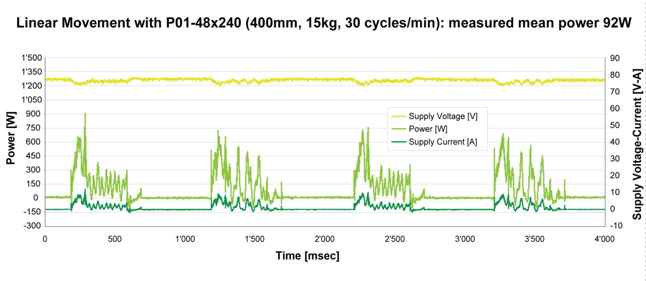 זמן המיצוב הדרוש, 500ms, עבור המשימה הנ”ל יכול להתקבל על-ידי תאוצה של 10 m/s² ומהירות של 1m/s. זמן התאוצה, שבו המנוע הליניאירי עושה עבודה חיונית אם כך הוא 100ms. זה אומר שצריכת החשמל האפקטיבית לוקחת רק חמישית מסך כל זמן המיצוב. בזמני העצירה והשיוט במהירות קבועה, המנוע אינו צורך חשמל מעבר למה שדרוש בכדי להתגבר על החיכוך. האנרגיה הקינטית שתיווצר בזמן התאוצה/עצירה תהפוך לאנרגיה חשמלית במנוע (כאפקט הגנרטור) ותישמר בקבלים הזמניים של מגבר הסרוו, עד שתבוא שוב לידי שימוש במחזור התנועה הבא. יישום זה יכול להתבצע