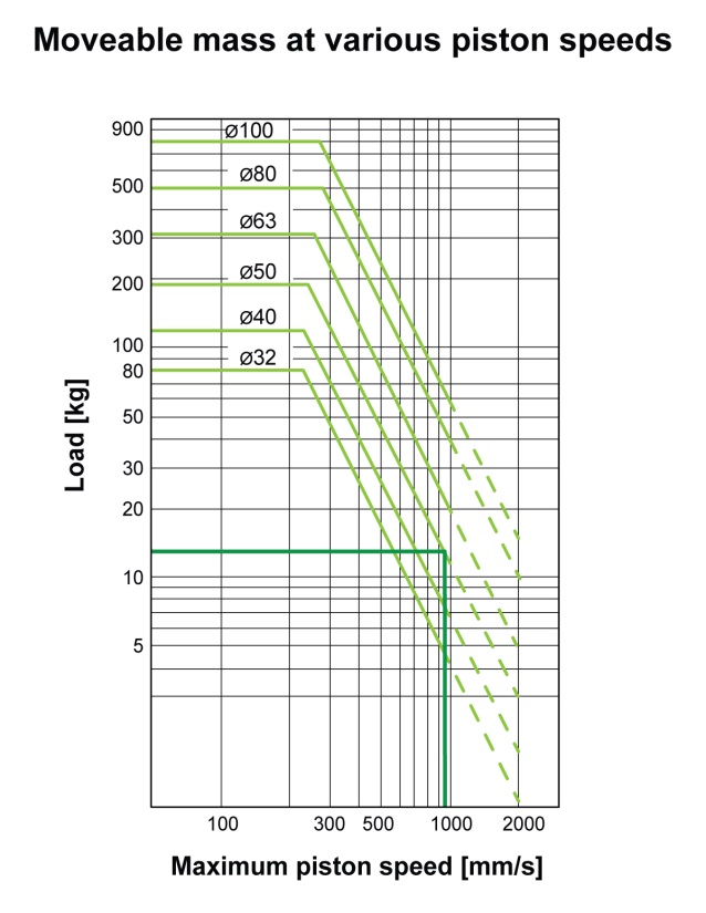 - תמונה 4. בעומס של 15 ק”ג ומהירות של 1 מטר לשנייה, תידרש בוכנה פנאומטית קוטר 50 מ”מ