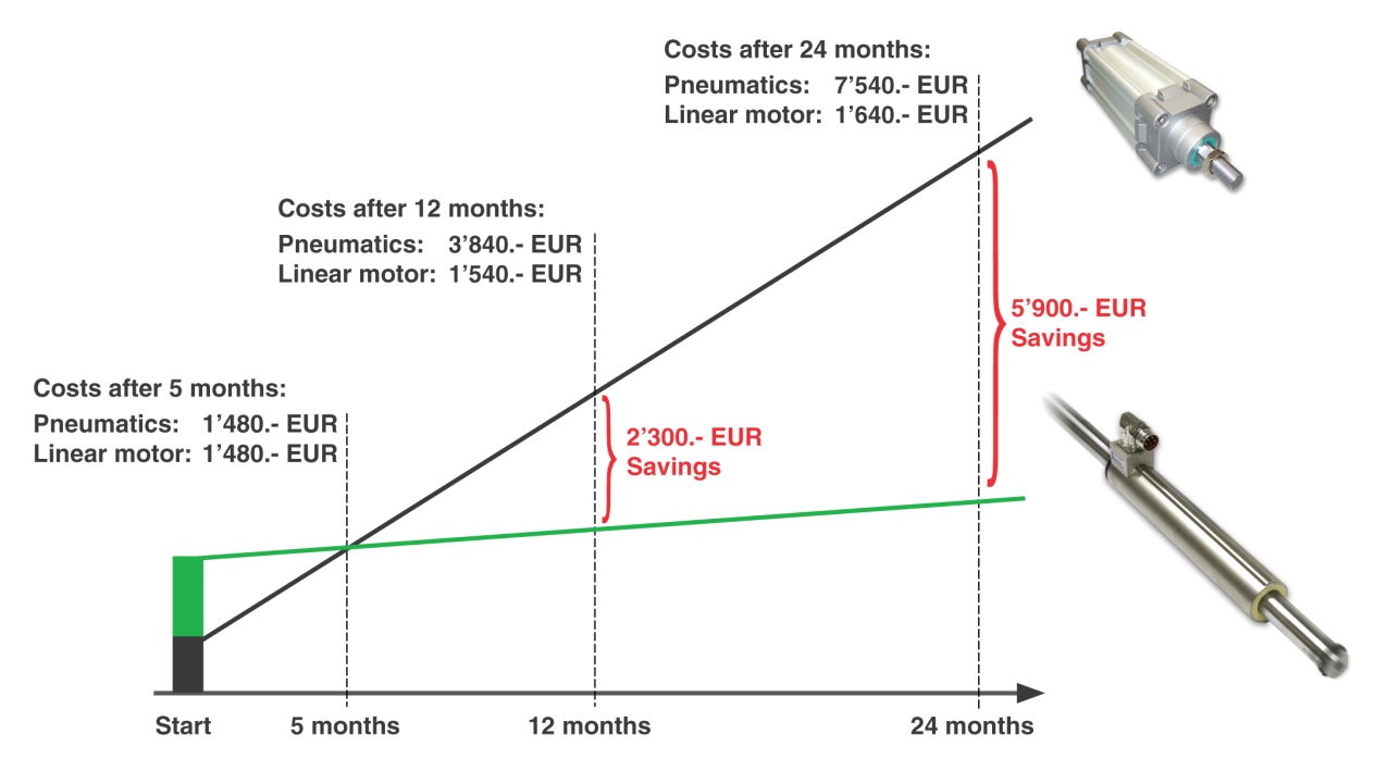 לעומת זאת, מערכת ליניארית חשמלית וכל מה שכרוך בה (כבלים, מגבר, וכו’), עולה יותר מאשר מערכת פנאומטית (כולל שסתומים, צינורות, וכו’). אולם עלויות האנרגיה אשר משמעותית נמוכות יותר, תורמות לכך שהמערכת החשמלית מחזירה את ההשקעה הראשונית תוך פחות מחצי שנה. לאחר נקודה זו החסכון נהיה משמעותי! עלויות האנרגיה בדוגמה שלנו עולות על ההשקעה הראשונית במערכת הפנאומטית לאחר שלושה שבועות בלבד. ניתוח של ההשקעה הראשונית ועלויות האנרגיה ביישום זה מראים שהחסכון בשימוש במנוע ליניארי תעשייתי בהשוואה לשימוש בבוכנה פנאומטית, הינו 8,625 ₪ לאחר 12 חודשים, ו-22,125 ₪ לאחר 24 חודשים.