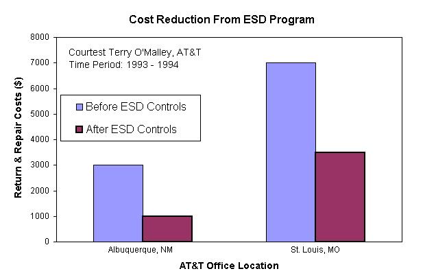 טרי אומאלי, לשעבר מנהל איכות ואחראי ESD בחברת AT&T, אסף מידע כזה לפני ואחרי יישום תוכנית לבקרת ESD. המידע שנאסף מראה בבירור חיסכון בהיקף של כ-50% בעלויות ההחזרות והתיקון, בשני האתרים שנסקרו (ראה תרשים 1).