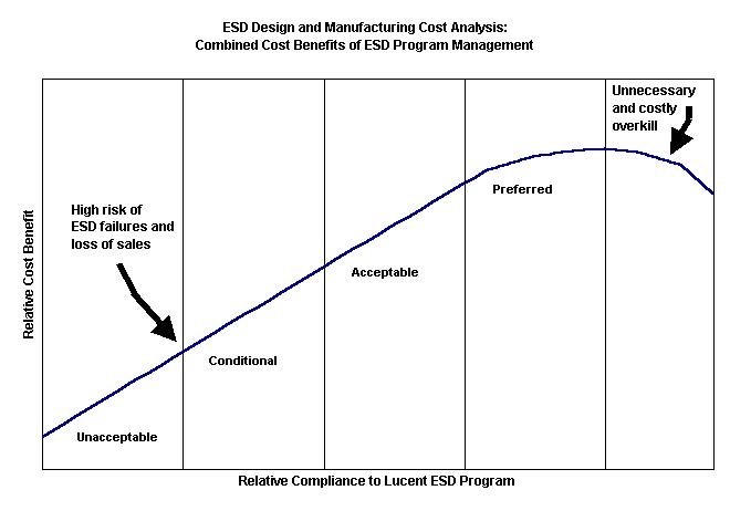 תרשים 2 מייצג באופן מופשט את הרווחים מהתוכנית לבקרת ESD של Lucent Technologies ביחס לרמת ההיענות לדרישות התוכנית. גובה ההחזר על השקעה (ROI) האופייני לתוכנית בקרת ESD הוא 100%. אמנם מחד התוכנית צריכה להיבנות כך שתמזער באופן יעיל את ההוצאות על יישומה, אולם מאידך אסור לשכוח כי פגיעה באמינות המוצר ובמוניטין החברה עשויים לעלות לחברה בהפסד של עשרה מליון דולר ואף יותר.