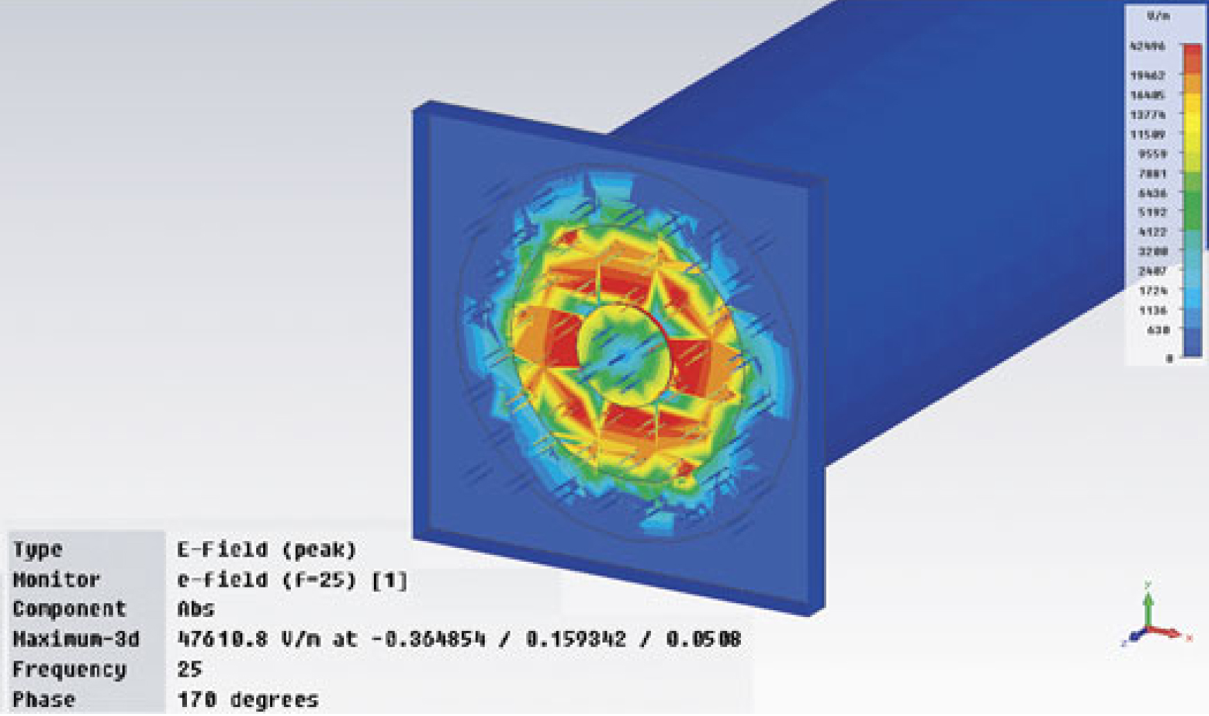 הדמיות EM בוצעו על נקודת החיבור של האלסטומר עם מגעי הקואקס השטוחים וכבל קואקסיאלי יחיד תוך שימוש ב-Microwave Studio של CST. איור 4 מראה חתך מקביל למישור האלסטומר, והוא תמונה רגעית של עצמת השדה בשיא בתווך ב-25 גיגה-הרץ. הצבע הכחול, המייצג עצמת שדה מאוד נמוכה, הנראה בכל מקום מחוץ למגע הסיכוך, הוא הוכחה שרעשים והפרעות (crosstalk) יהיו מאוד נמוכים.
