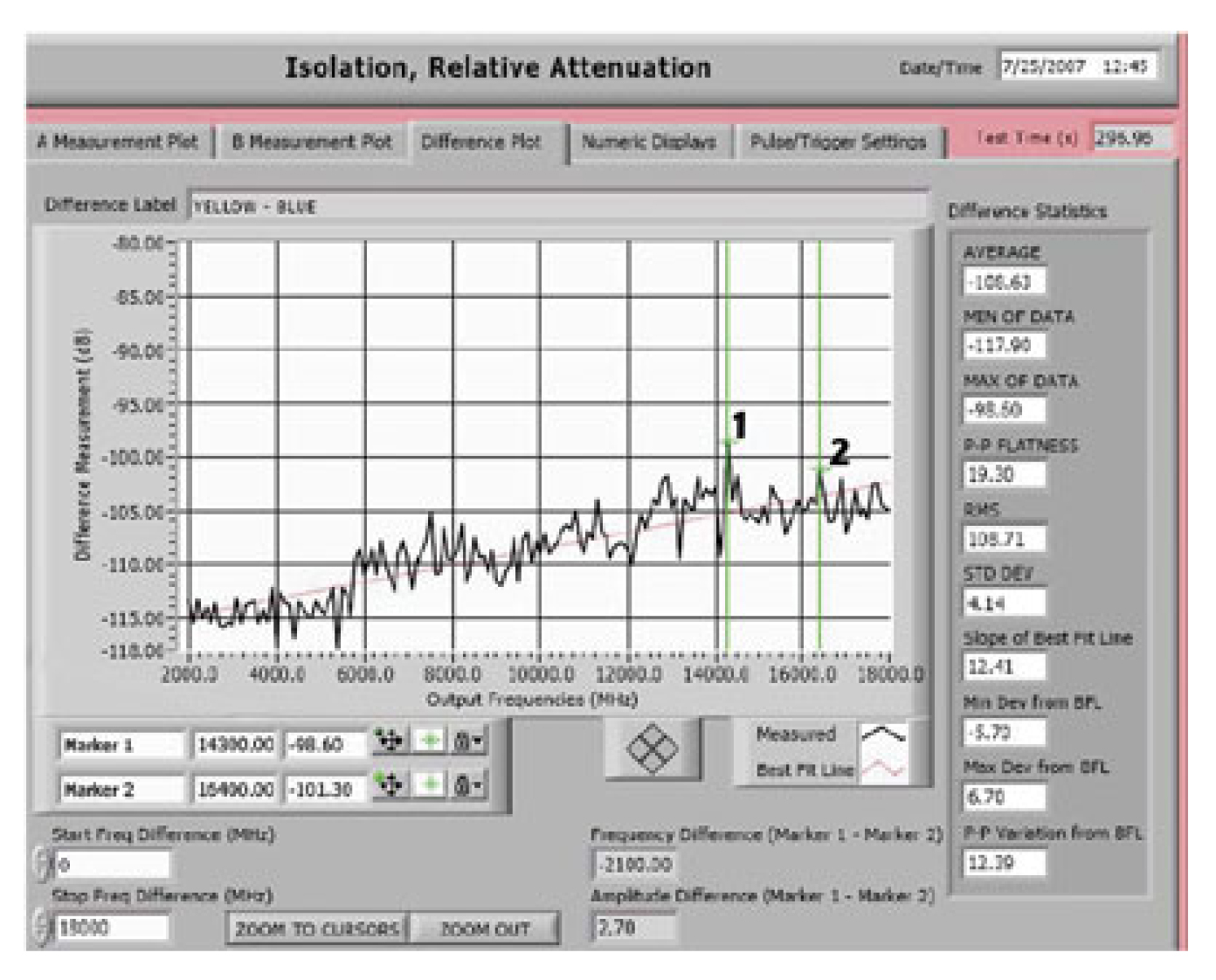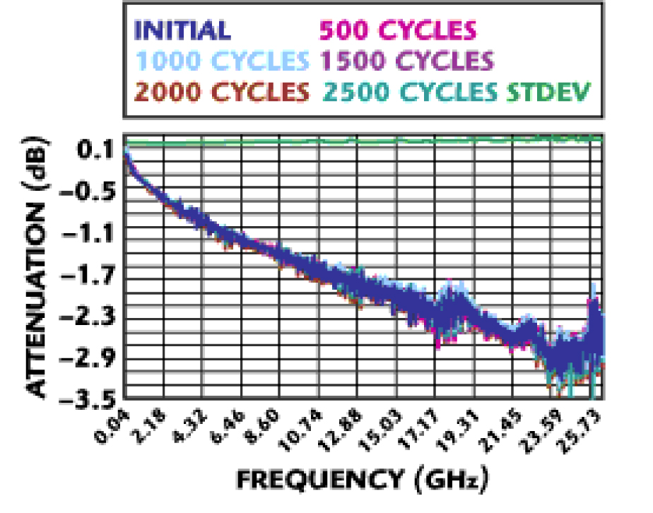 איור 6 מראה שהבידוד הנמדד בין מחברים סמוכים היה -100dB ב-15 גיגה-הרץ ובערך 95dB- ב-40GHz. היציבות של המחבר לאורך זמן גם כן נבדקה והוכח שהיה לו ניחות קבוע (סטייה תקנית של 0.05dB עד 26 גיגה-הרץ) לאחר יותר מ-2000 מחזורי חיבור (mating cycles), פי ארבע יותר מאשר מערכת מחברים אופיינית, כמתואר באיור 7.