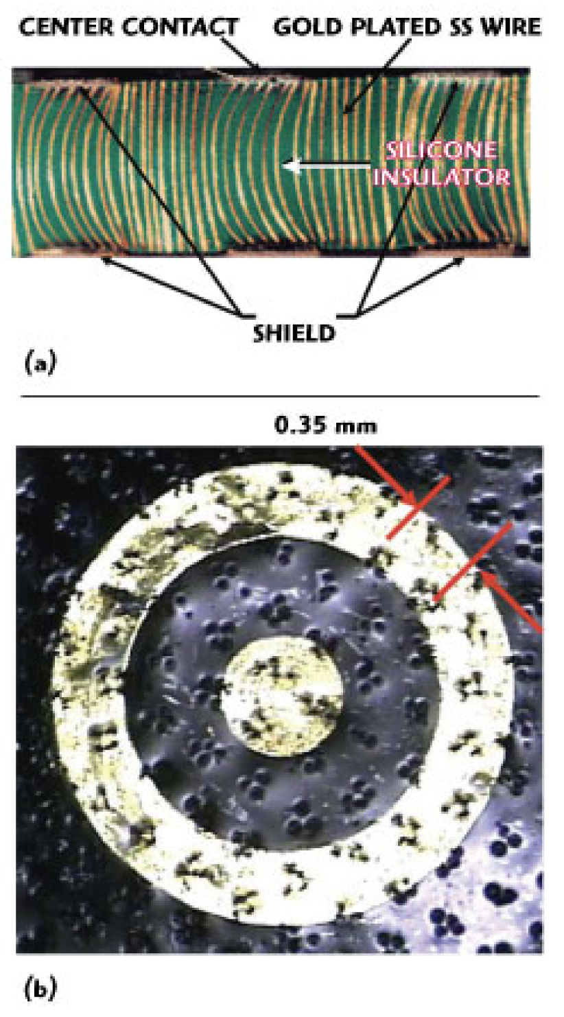 החיבורים הקואקסיאליים השטוחים (בצד שמאל) נלחצים אל האלסטומר אשר יוצר את המגע בין שני המגעים (פינים) השטוחים. איור 2 מראה את החתך של שני המחברים ואת הממשק האלסטומרי (הפס האופקי שבמרכז החתך). אין כל חלקים נעים ודרוש רק כוח חיבור בעל לחיצה נמוכה. המערכת מבטלת את הדקירה של המגעים (פינים). הממשק האלסטומרי. עשוי מסיליקון מסדרת FujipolyWSC בשילוב של סיבי פלדת אל-חלד מצופה זהב. הסיבים הם בקבוצות הבנויות מ-3 עד 6 סיבים מוליכים והקבוצות הן במרווח של 0.35 מ”מ אחד מהשני. איור 3a מראה מבט של חתך האלסטומר בו המוליכים מתקמרים (מתכופפים) במקומות שבהם נוצר מגע (לחץ). שטח המגע המרכזי והסיכוך החיצוני מוצגים שם. הסיבים המוליכים מבודדים אחד מהשני על-ידי מבודד הסיליקון.