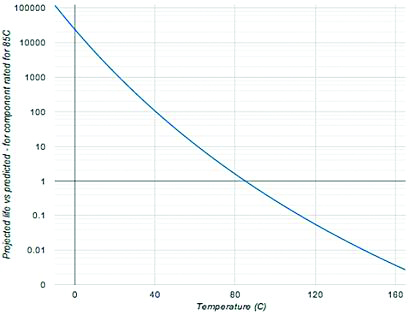 - איור 4. השפעת הטמפרטורה על החיים החזויים של רכיב. העקום מבוסס על רכיב מוגדר עבור 850C ואנרגיית פעילות (Ea) של 1.0