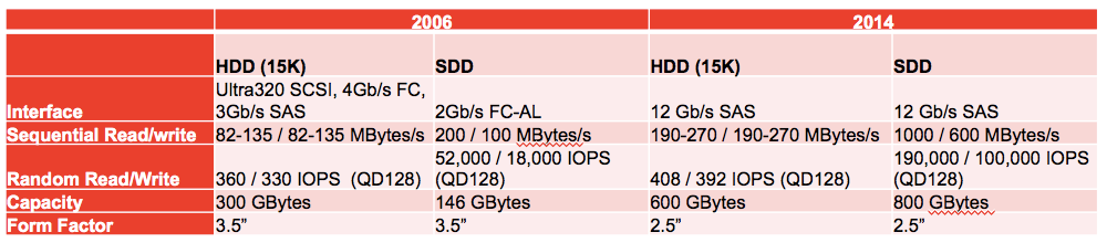 טבלה 1 מציגה את הפער הדרמטי בין ביצועי ה-HDD, שנשארו כמעט סטטיים לאורך השנים, לבין ביצועי ה-SSD לרבות בתחום ה-random read/write. ביצועי