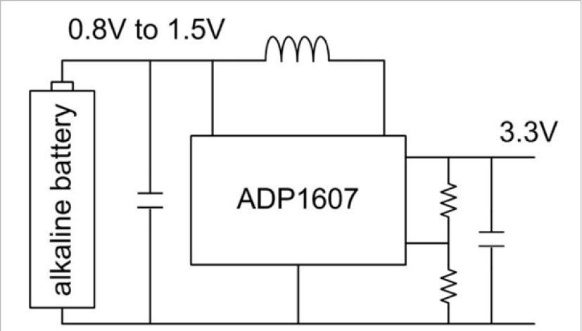 מערכות בריאות ניידות זולות יותר, המשמשות רק לפרקי זמן קצרים, ניתנות לתכנון בעזרת סוללה אלקליין לא-נטענת. בשל שיקולי משקל ועלות יש יתרון בשימוש בסוללה אחת בלבד מאשר המצב בעל שתי סוללות המקובל. הקושי במערכות בעלות סוללה אלקליין יחידה הוא בכך שמתח הסוללה הוא רק בתחום של 0.8 וולט עד 1.5 וולט. כדי להזין את האלקטרוניקה, דרוש וסת הגברה (boosting regulator) המסוגל לספק מתחי מבוא כה נמוכים נוכח יעילות הספק גבוהה. איור 2 מציג את ה-ADP1607 בתור צעד ראשון בהמרת הספק עבור יישום מסוג זה. הוא מפיק 3.3 וולט שהם דרושים ברוב המערכות.