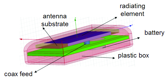 ניתן לתכנן אנטנות קטנות מסוגים שונים עבור היישום הנ”ל. במקרה שלנו האנטנה הינה משטחית ומודפסת מסוג Microstrip עם קצר בקצה האלמנט הקורן (על מנת להקטין את המימדים). האלמנט הקורן (נחושת) הינו בעל מימדים: