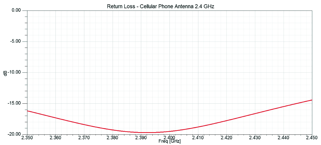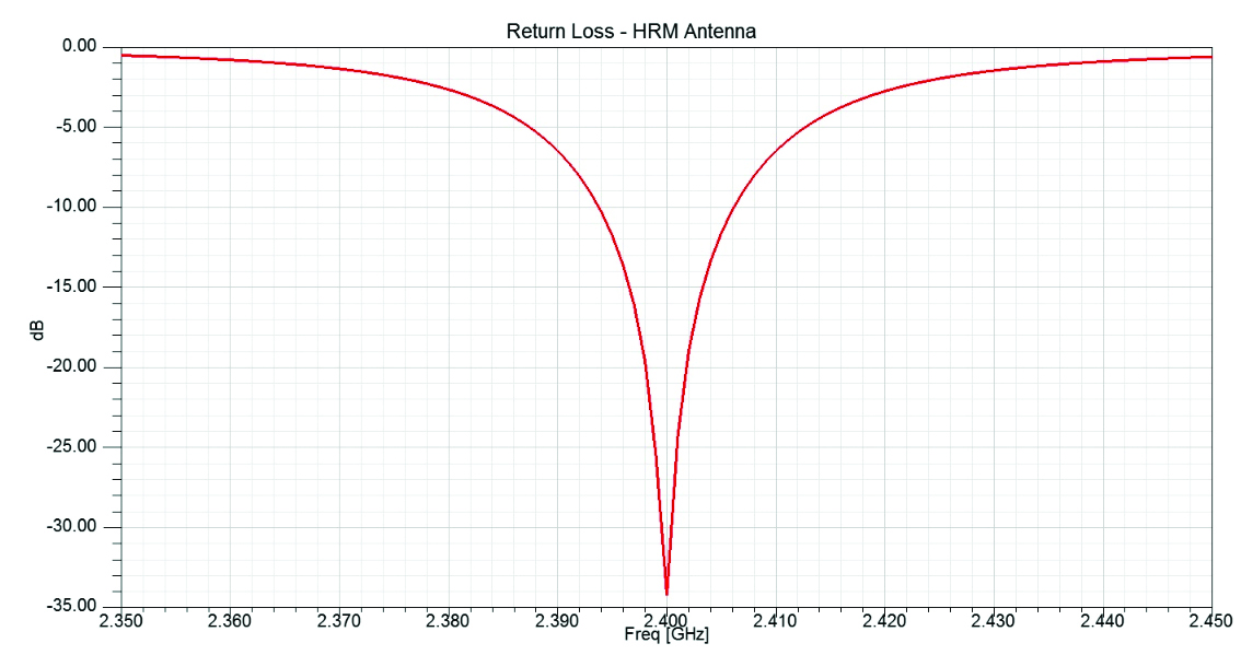 מכיוון שהאנטנה מחוברת לנקודת ההזנה של 50Ω, אנו נדרשים לתכנן את האנטנה לאימפדנס זהה בתדר העבודה 2.4GHz. המדד של מקדם ההחזרה מראה על טיב תאום האימפדנסים בין האנטנה לבין נקודת ההזנה. ככל שמקדם ההחזרה נמוך יותר, כך האנטנה תהיה עם נצילות גבוהה יותר. באנטנות מסוג זה מקובל שמקדם ההחזרה יהיה נמוך מ – -10. ניתן לראות מאיור 2 שמקבלים תהודה בתדר 2.4 ומקדם ההחזרה הינו -34.